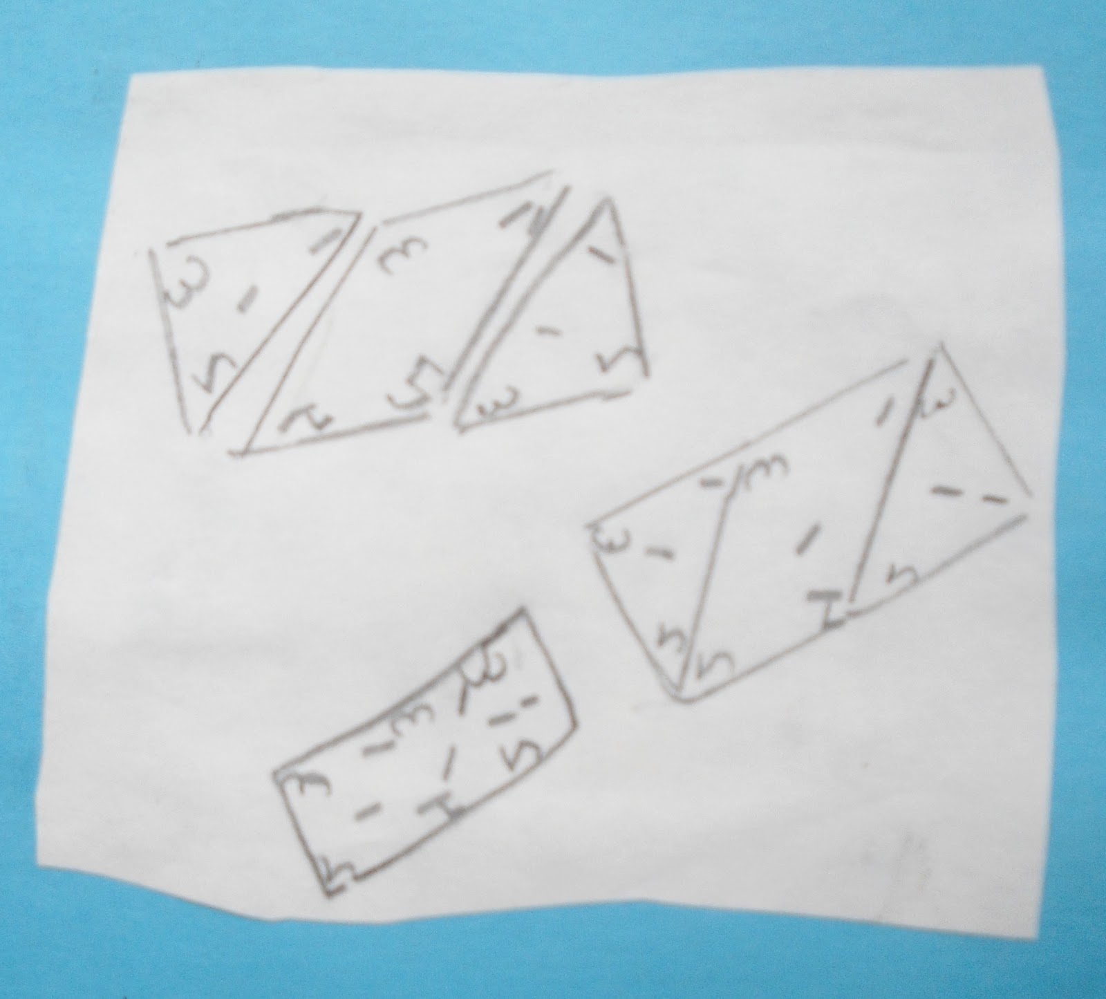 “This rectangle you see is made up of a parallelogram and two triangles. Really they’re just shapes, but when you put them together they make a rectangle.” [It looks like she’s numbered the inside angles of the individual shapes. It also looks like she is again showing the process individual shapes merging into the intended new shape.]