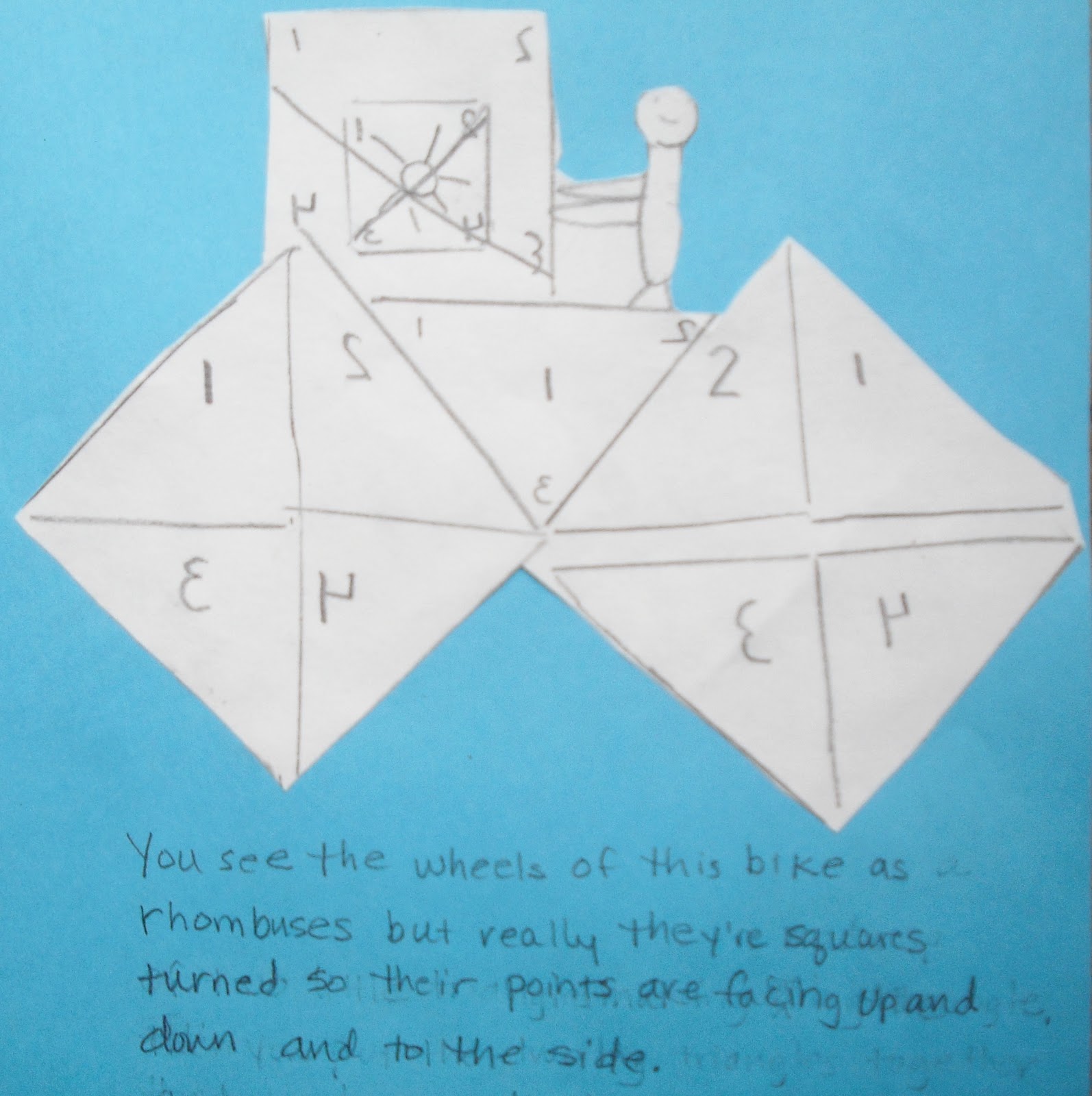 “You see the wheels of this bike as rhombuses but really they’re squares turned so their points are facing up and down, and to the side.” [She was gesturing this first, and at first she used the word ‘flipped’ to describe the orientation of the square wheels. I focused her on the orientation of the corners to describe how the square was turned.]